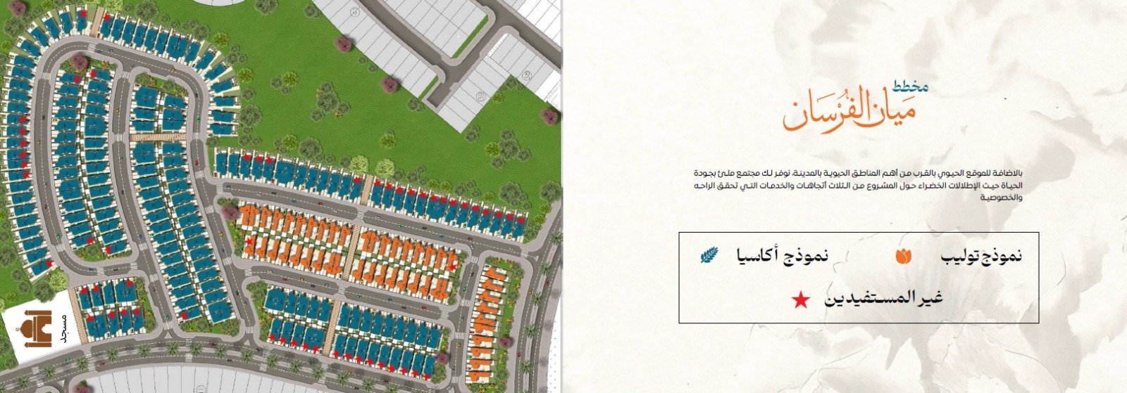 A residential villa compound covering an area of 60,000 square meters, It is located in the northeast of Riyadh in Al Fursan Suburb, one of the National Housing Districts, east of Al Janadriyah Road. The project includes 222 villas in Salmani style with areas of 285m² and 222m², featuring two types: Tulip (3 bedrooms, 6 bathrooms – sold out) and Acacia (5 bedrooms, 7 bathrooms).